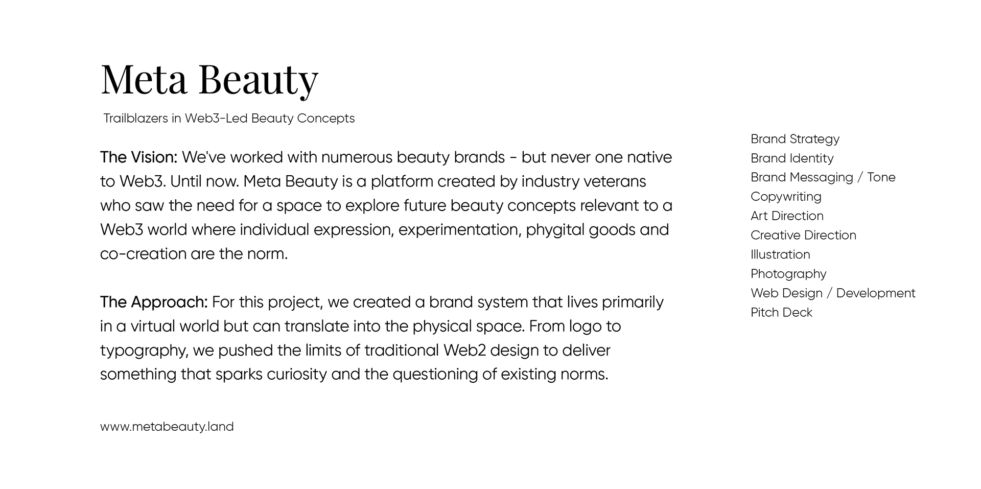 Meta Beauty is a platform created by industry veterans who saw the need for a space to explore future beauty concepts relevant to a web3 world where individual expression, experimentation, phygital goods and co-creation are the norm.