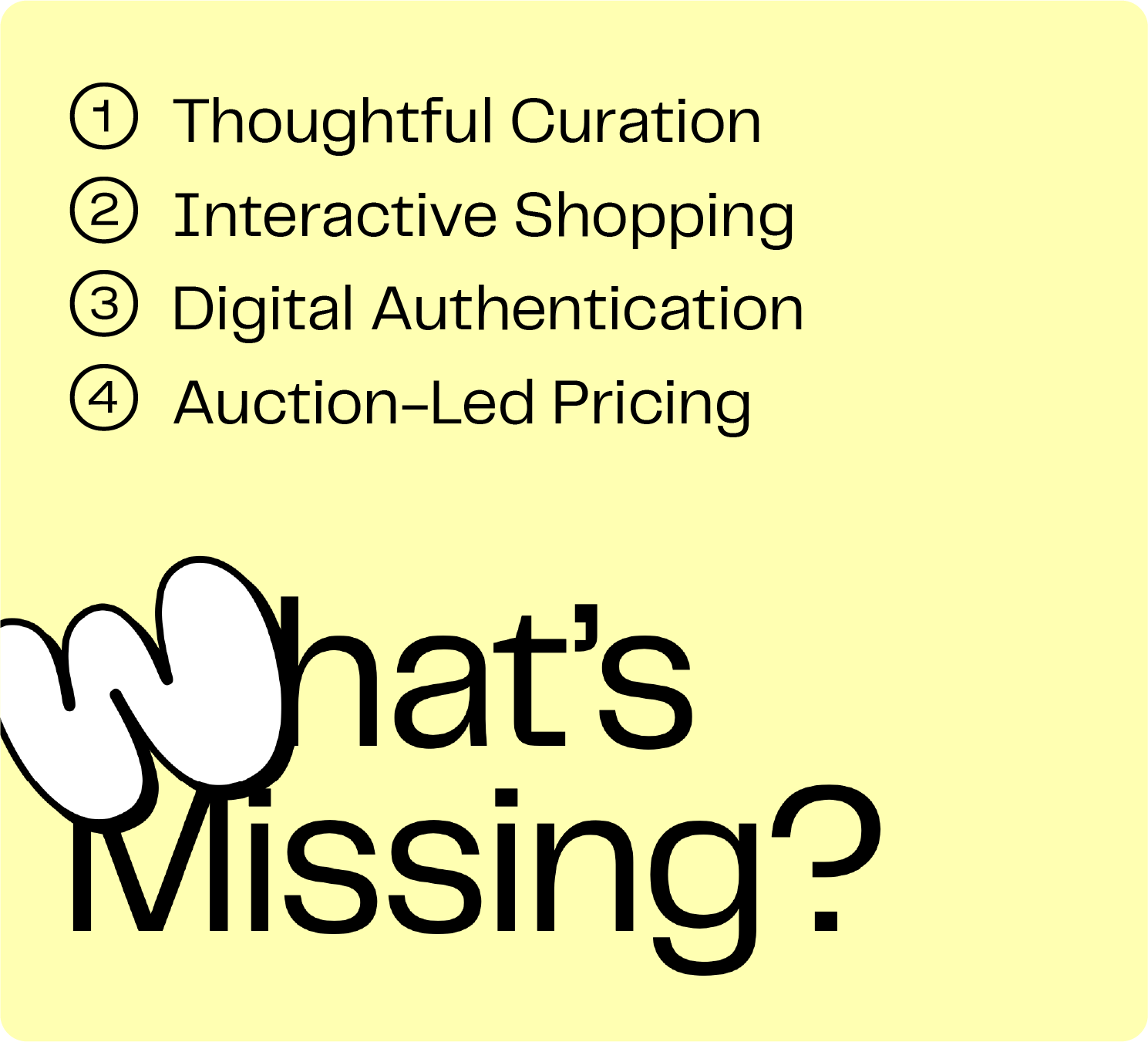 Colin and I developed a brand identity centered on the concept of an art gallery where each individual item is showcased as if it were presented at a physical art auction. We included design assets and photography with a rich color palette to reflect the vibrancy of each unique story of every seller and object - as well as candid and object photography playing with space within its composition to convey a more personable experience.